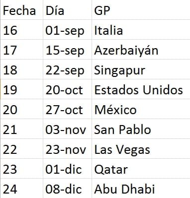 El 23 de noviembre, Las Vegas acogerá al GP por segunda vez, y las últimas dos fechas serán en Bahrein (1 de diciembre) y Abu Dhabi (8 de diciembre).