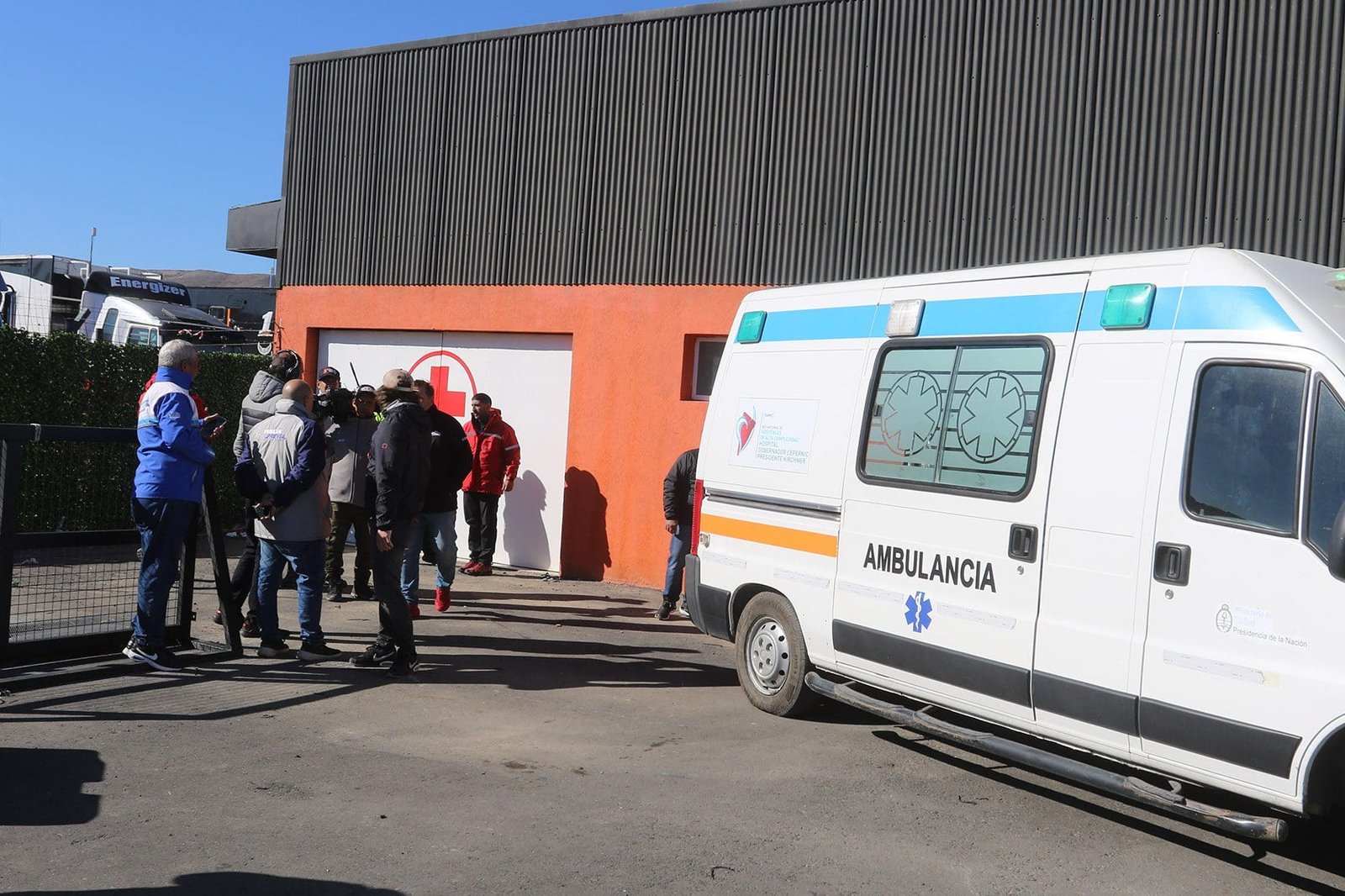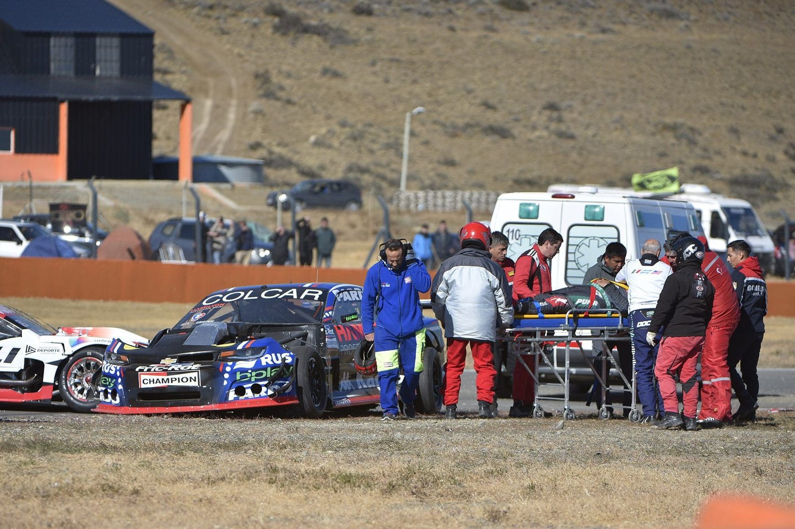 Toloza, de lentes oscuros, traslada a Mazzacane al hospital del autódromo de El Calafate.