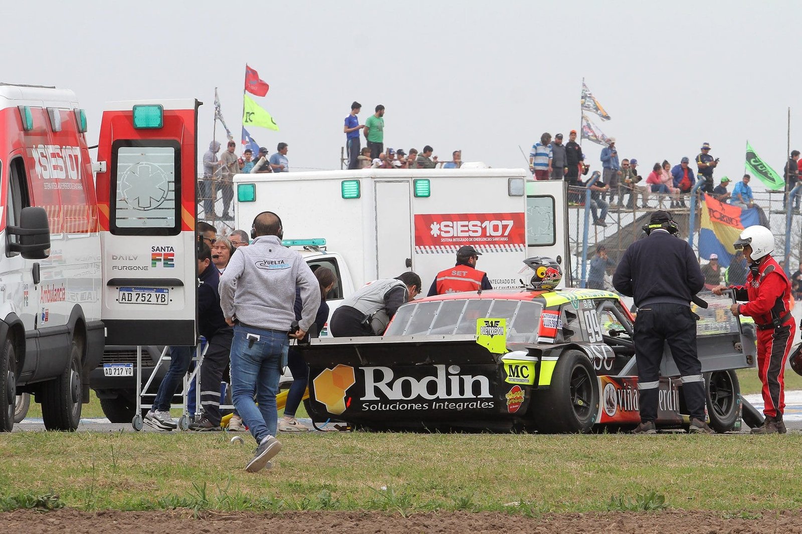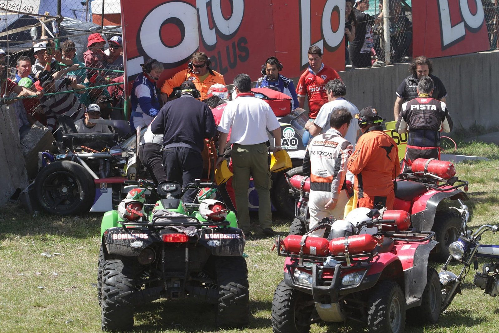 “Desde 1997 que estoy en el TC junto a Rodolfo”, expresa el Potro. “En promedio, en cada carrera, somos unas 40 personas involucradas a la sanidad, entre médicos, choferes, enfermeros y nosotros en los equipos de rescate. Hay siete ambulancias por circuito, más las del público, cuatro cuatriciclos en pista, camionetas médicas con bolsos de trauma completos, desfibriladores externos automáticos y medicación. Y hay carreras, en las que son con recarga de combustible, en las que tenemos más personal sanitario, más bomberos y más personal en boxes”, cuenta.