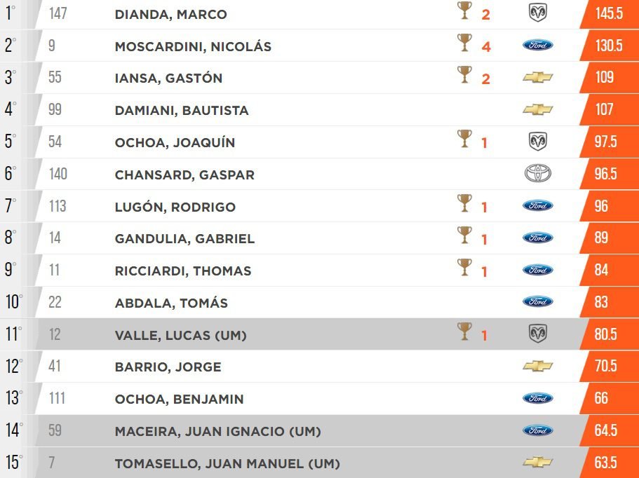 Más atrás se ubica Gastón Iansa, con 109, quien fue sancionado con 20 segundos por un toque con Nicanor Santilli Pazos y quedó 17°. Bautista Damiani, con el 10° puesto en Paraná, se colocó cuarto con 107, mientras que Joaquín Ochoa, 9°, suma 97.5.