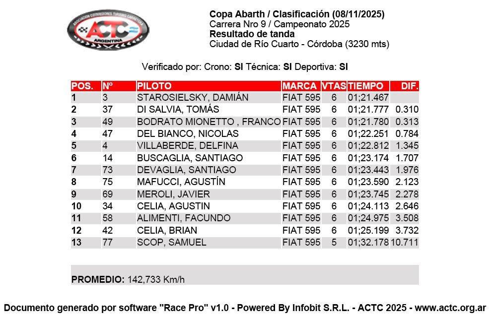 En la clasificación por la 9ª y penúltima fecha del calendario de la Copa Abarth Argentina, en el autódromo “Ciudad de Río Cuarto”, el puntero del campeonato Damián Starosielsky marcó el mejor tiempo y se quedó con la pole position.