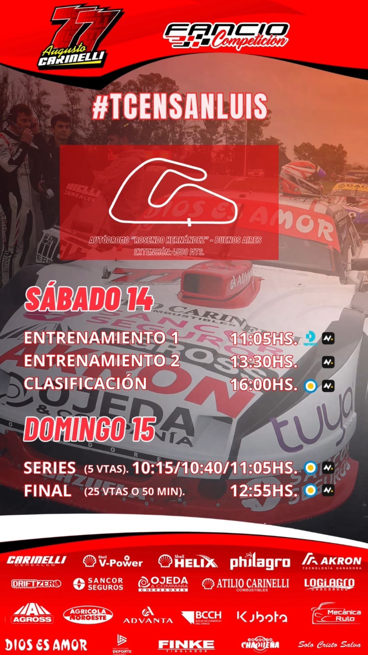 Con todo listo, el equipo emprende por estar horas el viaje hacia San Luis, donde la actividad para Carinelli y el TC comenzará el día sábado con dos ensayos como es habitual desde las 11:05 y 13:30, para luego pasar a la clasificación que arranca a las 16.