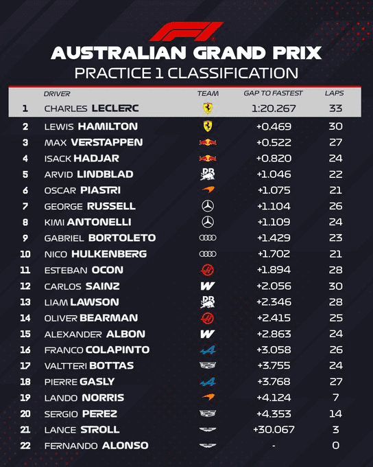 Lo llamativo de esta sesión de entrenamientos las marcadas diferencias en los registros. Por caso, entre Leclerc y Arvid Lindbland, de destacada actuación en su primer GP como piloto titular, hubo 1s046.