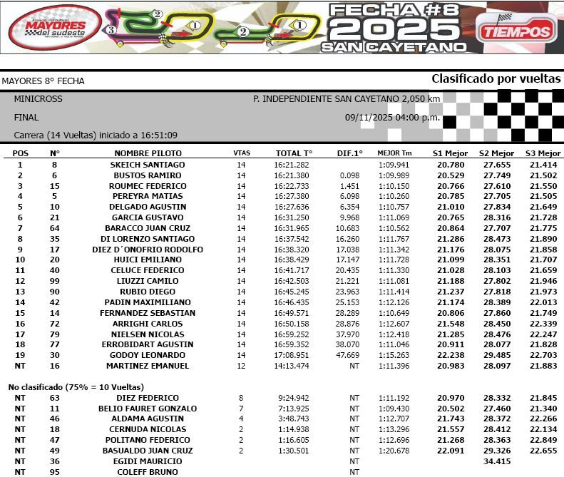 Las Mayores del Sudeste disputaron la última fecha de la temporada 2025 y Matías Álvarez en la Mar y Sierras A (se había consagrado en la cita anterior); Santiago Skeich en Minicross, Leonel Reynosa en Mar y Sierras B y Guillermo Ruppell en TC del 40 se coronaron y en la próxima temporada lucirán el “1” en los laterales de sus autos.