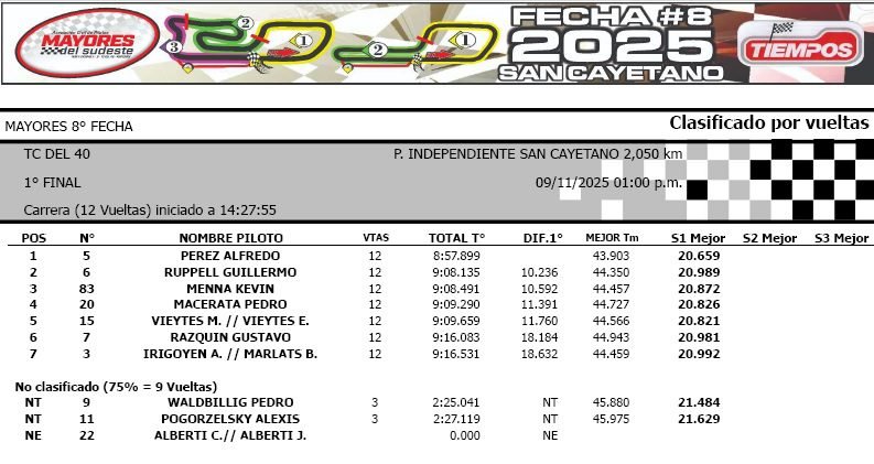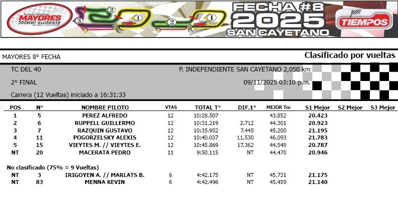 Mientras que en TC del 40, Guillermo Rupell con los 2° puestos en sendas pruebas de la divisional alcanzó la punta del campeonato. Pedro Macerata, 4° y 6°, se ubicó como escolta en el campeonato, en tanto que Alfredo Pérez, ganador en ambas carreras, finalizó 3° en el año.