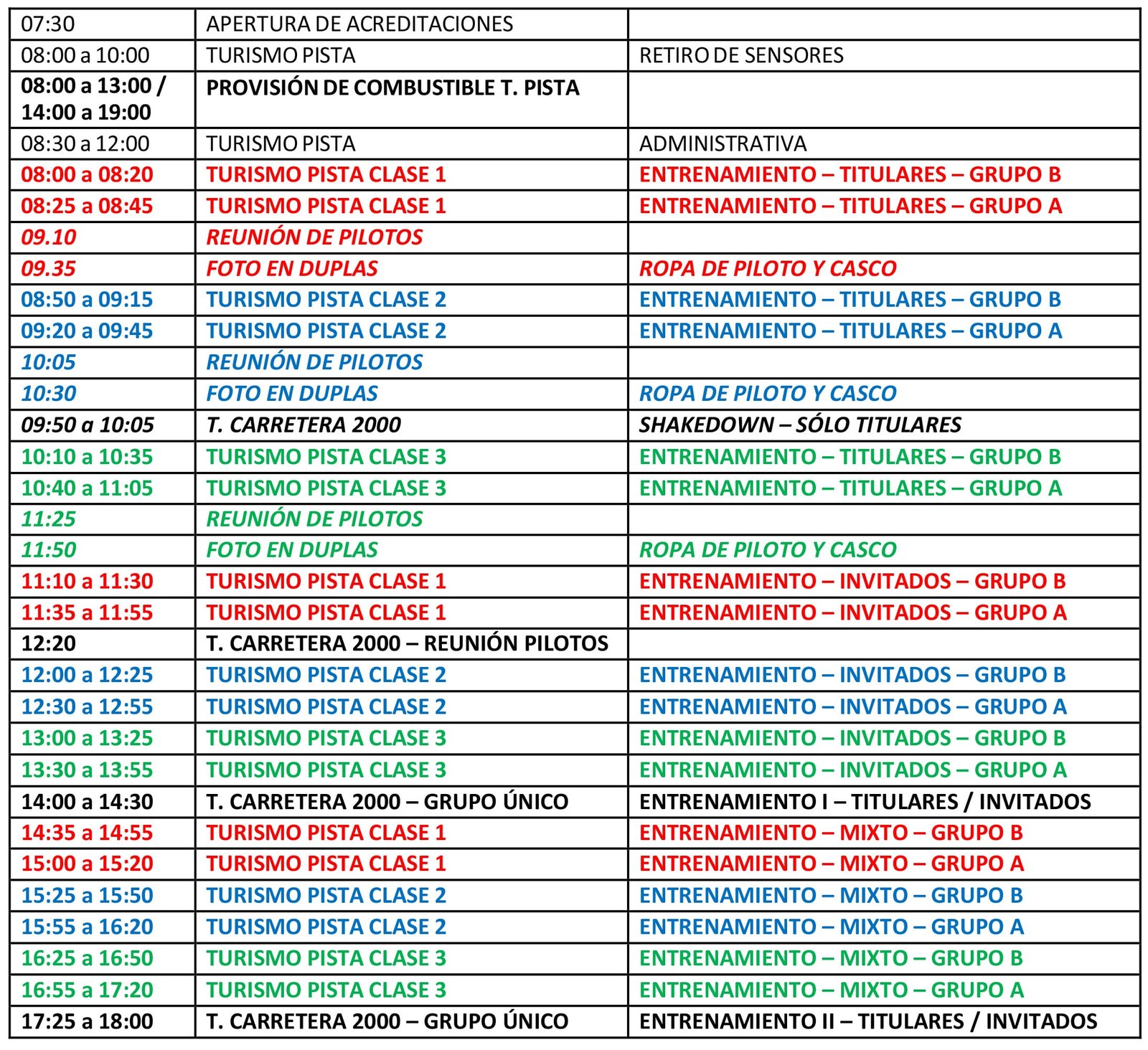 La primera jornada servirá como entrenamiento, tanto para los pilotos titulares como para los invitados. Las primeras salidas a pista serán individuales y, las últimas, podrán intercambiarse los turnos en tandas mixtas.