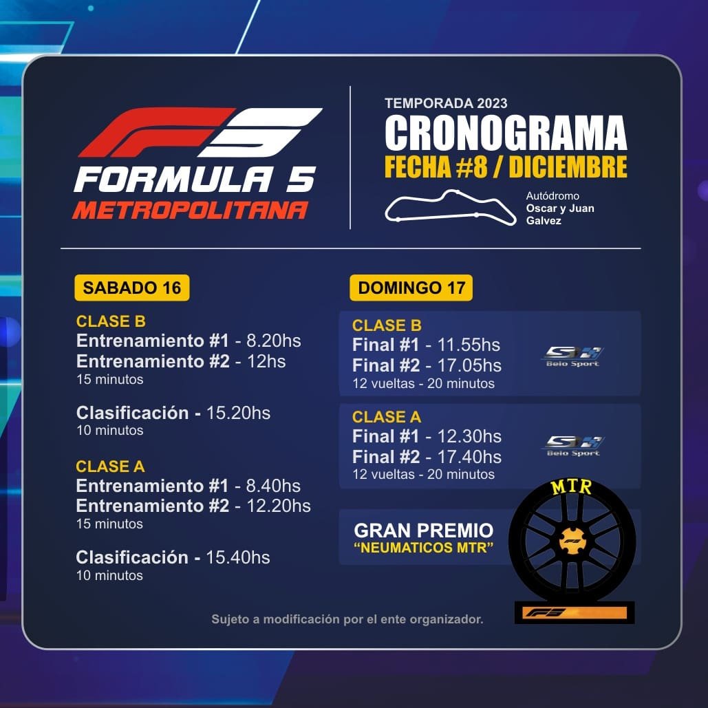 La Fórmula 5 Metropolitana culminará los campeonatos de las Clases A y B este fin de semana en el autódromo de Buenos Aires, por la 8ª y última fecha de la temporada, con el “Gran Premio Neumáticos MTR”.