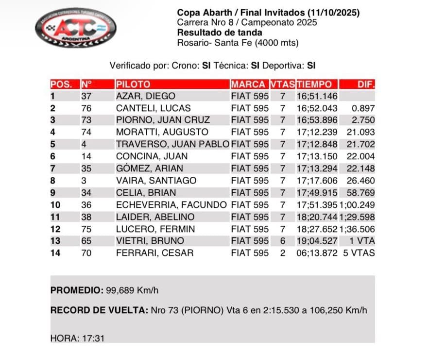 Diego Azar tuvo una actuación brillante en la carrera de pilotos invitados que la Copa Abarth desarrolló en el autódromo de Rosario, escenario de la 8ª fecha de la temporada.