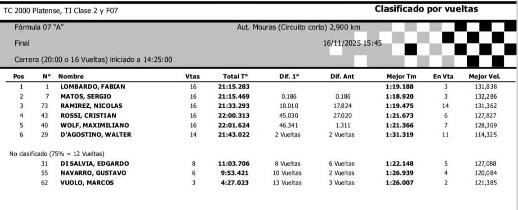 Una fecha antes de la finalización del certamen de la Fórmula 07, Fabián Lombardo ganó la final de la Clase A en el autódromo de La Plata con el Fiat 600 que prepara el EFEDE Competición que dirige Diego Fiumara.