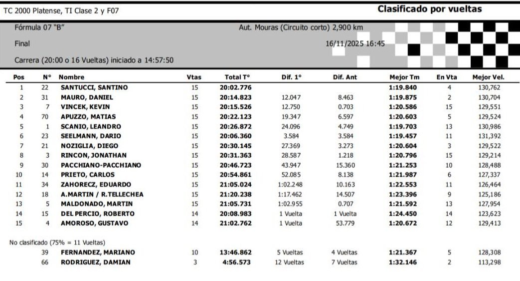 El de Avellaneda aprovechó las circunstancias de carrera y saltó a la punta después de las distintas situaciones vividas por Leandro Scanio y Darío Seelmann, además del retraso de Kevin Vincek, adueñándose del liderazgo y de su primer triunfo en la categoría, seguido por Daniel Mauro con el Palio, que heredó el puesto de Dario Seelmann que fue recargado por toque con Scanio, quedando tercero Vincek, cuarto Matías Apuzzo de gran tarea, quinto Scanio tras la recuperación, sexto Seelmann tras el reposicionamiento, séptimo Diego Noziglia, octavo Jonathan Rincón que largó desde el fondo, noveno Franco Pacchiano y décimo Carlos Prieto que completó el top diez.