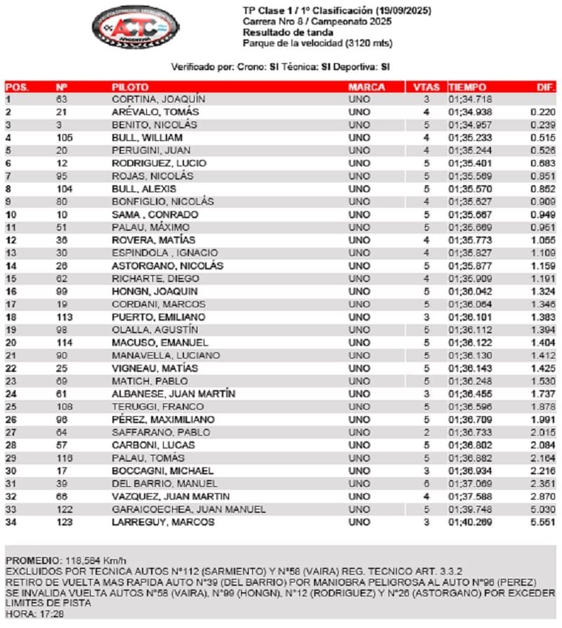 El de Nicanor Otamendi marcó un tiempo de 1m34s718 en su mejor pasada y doblegó a Tomás Arévalo por 220 milésimas. En la tercera ubicación se colocó Nicolás Benito, a 239.