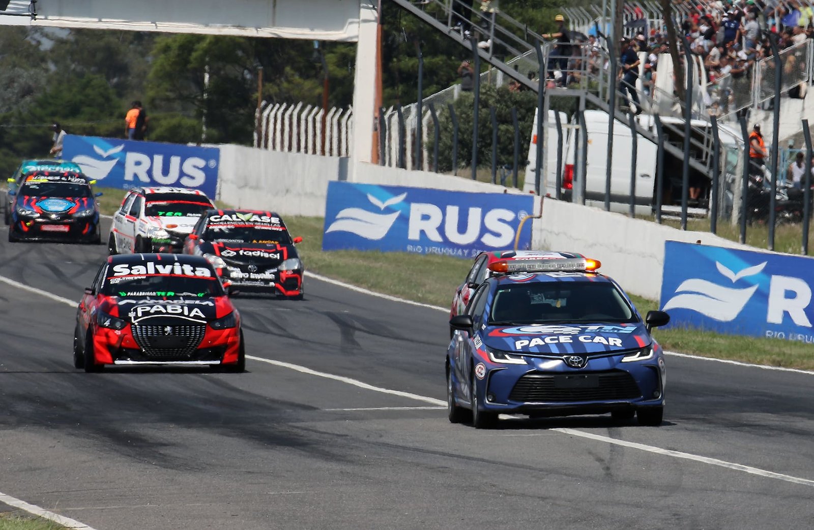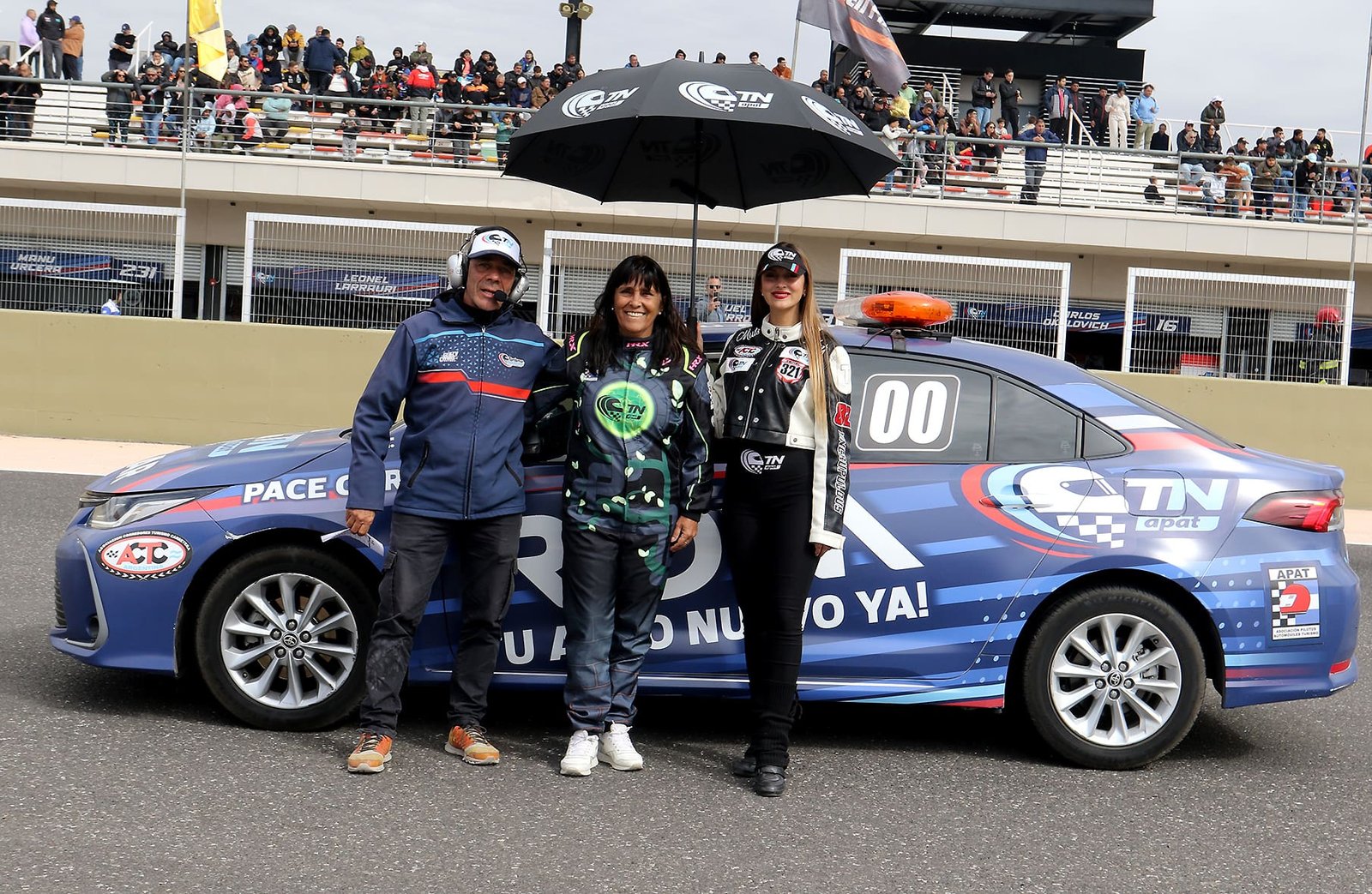 El Toyota que oficia de Pace Car en el TN se detiene en la recta del autódromo de San Juan y la conductora se baja. Saluda a los oficiales de pista, también al fotógrafo de Tribuna 2 y posa para la cámara.