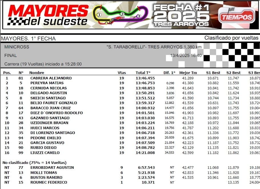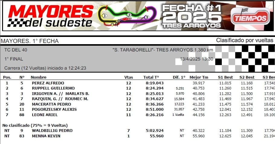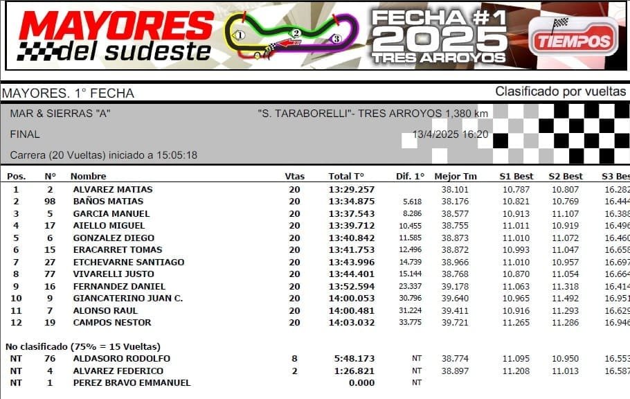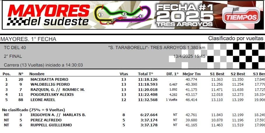 Las Mayores del Sudeste comenzaron los campeonatos en el autódromo “Segundo Taraborelli” de Tres Arroyos, con triunfos de Matías Álvarez (Mar y Sierras A), Leonel Reynosa (Mar y Sierras B), Alejandro Cabrera (Minicross), Alfredo Pérez (TC del 40 final 1) y Pedro Maceratta (TC del 40 final 2).