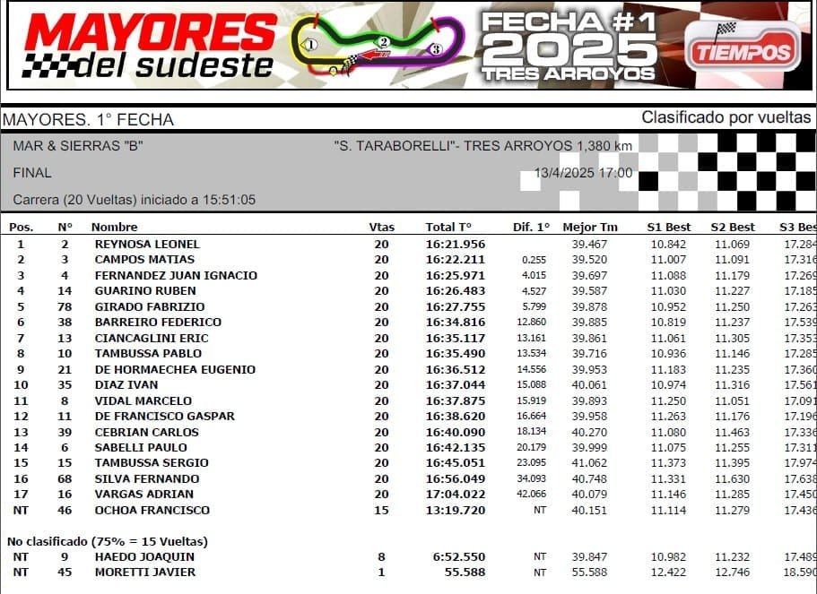 En la B, Reynosa también fue el más veloz en la clasificación y alcanzó la primera victoria del año, siendo escoltado por Matías Campos y Juan Ignacio Fernández.
