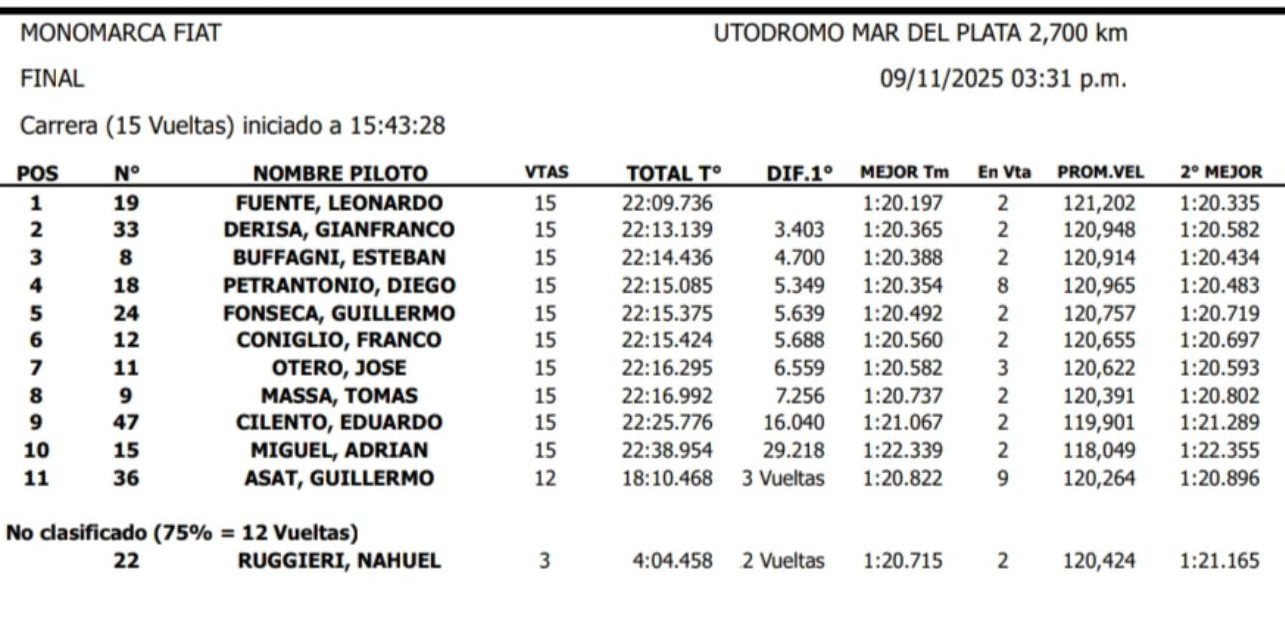 Lo escoltaron en el podio Gianfranco Derisa, con F128, y Buffagni con Uno. También cantaron presente José Otero, Tomás Massa, Adrián Miguel, Guillermo Asat, Nahuel Ruggeri, Diego Petrantonio, Franco Coniglio, Eduardo Cilento y Guillermo Fonseca.