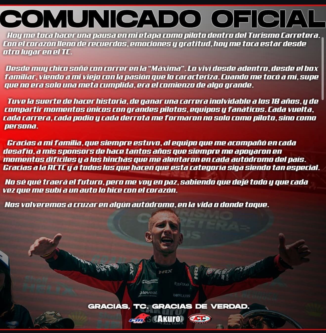 “Es hora de decirle adiós al equipo. Quiero agradecerles a Mauro Medina, a Martín Fiora y a todo el equipo por los momentos y logros obtenidos durante estos años. Fue un placer trabajar con ustedes. ¡Les deseo todos los éxitos!”, posteó el piloto.