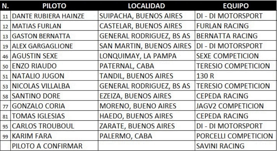 Para este compromiso serán 13 los participantes, destacándose los regresos de Dante Rubiera y Enzo Riaudo, y el debut de Natalio Jugon con un auto del equipo 130R.