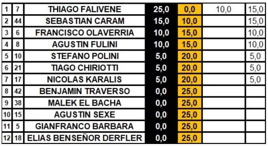 Serán 12 los protagonistas que comenzarán la disputa por el título 2025 en cuatro fechas apasionantes. Thiago Falivene fue el ganador de la Etapa regular y arrancará el torneo con 25 unidades, producto de los diez puntos bonus y las tres victorias logradas en el año.