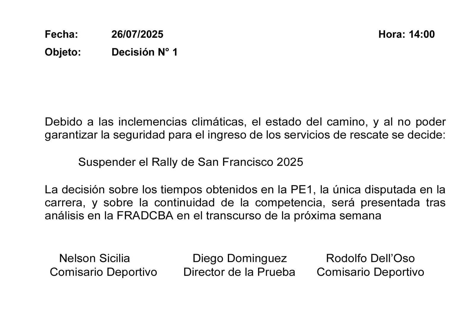 Si bien el Rally es una disciplina para audaces, valientes y con el clima siempre de protagonista, la decisión se tomó ante la dificultad de los vehículos de rescate y ambulancias, ante algún accidente.