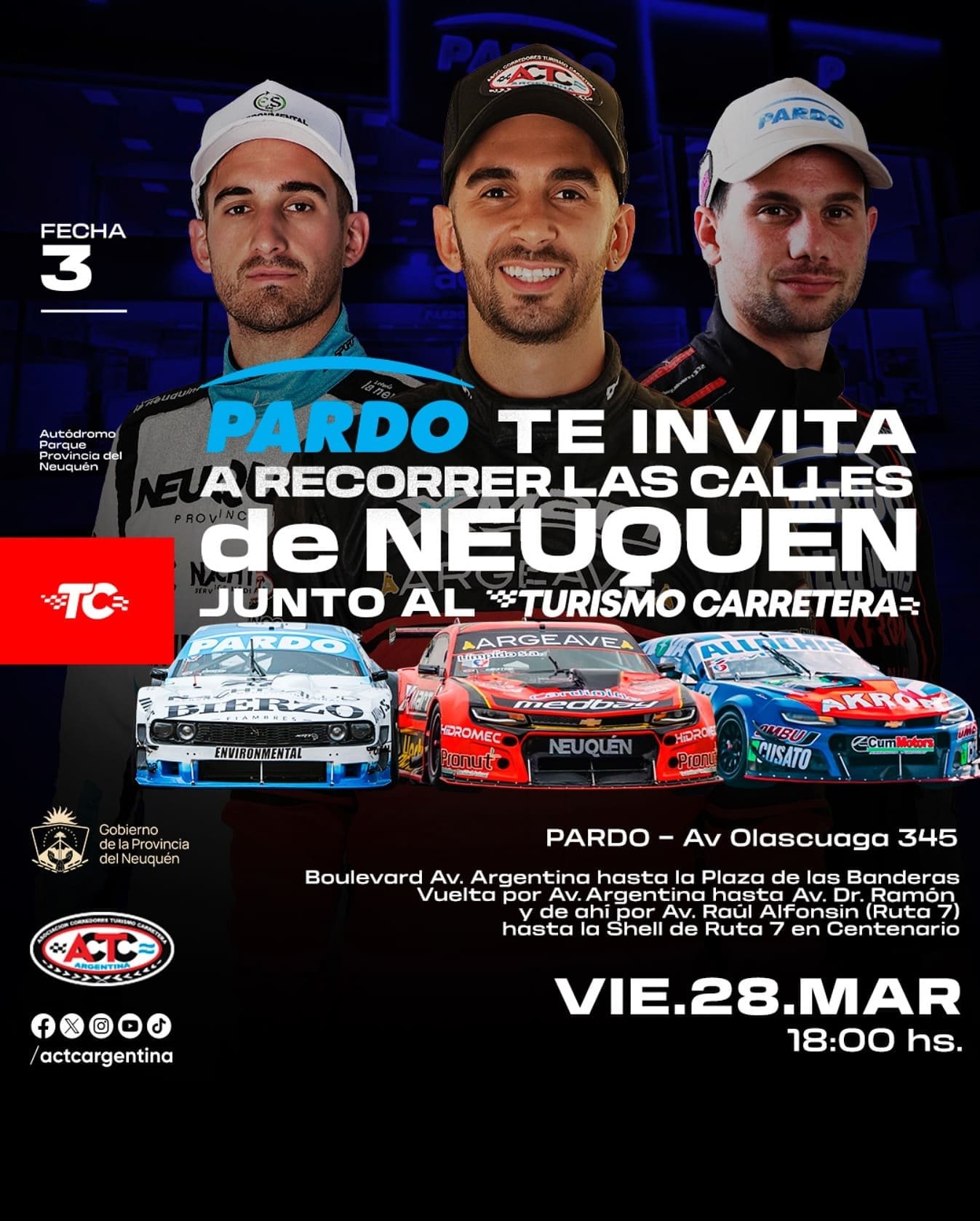 Como parte de la promoción de la fecha de este fin de semana en el autódromo de Centenario, Neuquén, por el tercer capítulo del año, tres autos de TC recorrerán las calles de la ciudad.