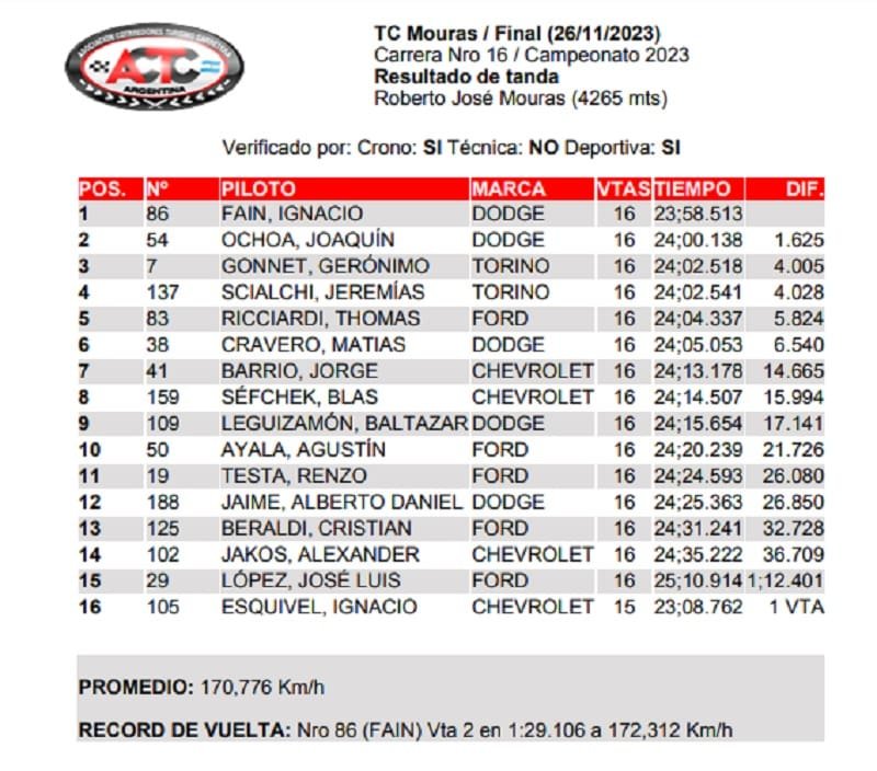 Ignacio Fain dominó el cierre de calendario de principio a fin, ratificando el gran potencial de la Dodge alistada por el Galarza Racing y superando sin sobresalto alguno a su escolta Joaquín Ochoa quien se ubicó en la posición de escolta con la Dodge del JP Carrera.