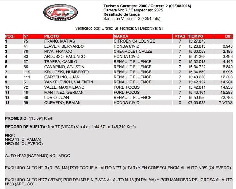 Vitar iba a terminar en el primer lugar, pero la resolución de los comisarios deportivos que investigaron las maniobras con Quevedo y con Ardusso determinaron su exclusión. Por consiguiente, la victoria quedó en manos de Matías Frano, segundo terminó LLaver, tercero Riva, cuarto Ardusso y quinto Trappa.