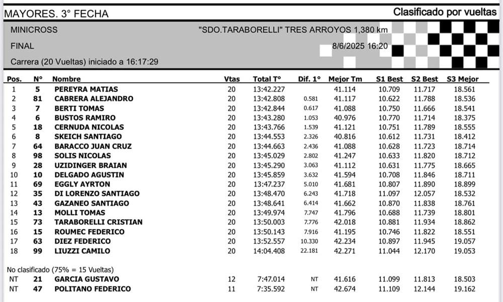 En la Minicross, la victoria quedó para Matías Pereyra, escoltado por Alejandro Cabrera y Tomás Berti. Con estos resultados, Cabrera lidera el campeonato con 120 puntos, seguido por Pereyra con 108.50.