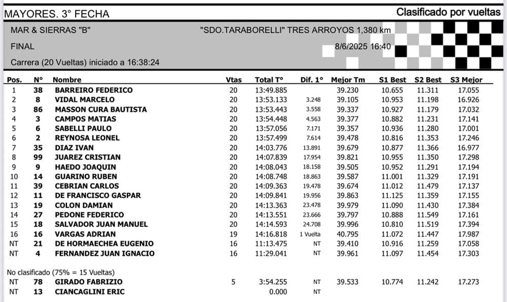 Por el lado del Mar y Sierras B, Federico Barreiro se quedó con la victoria, seguido por Marcelo Vidal y Bautista Masson Cura. En el certamen, Matías Campos, quien finalizó 4°, es el puntero con 131 puntos, escoltado por Leonel Reynosa (6°) a solo medio punto.