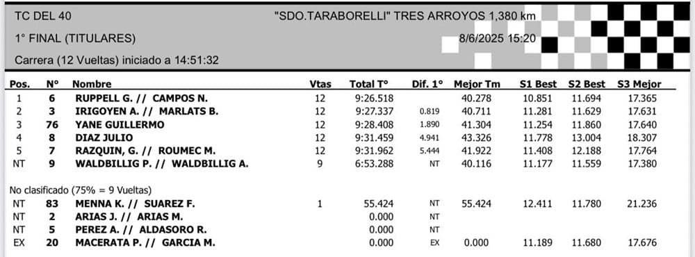 En la final de titulares del TC del 40, Guillermo Ruppell se alzó con el triunfo. Ariel Irigoyen llegó en la segunda posición y Guillermo Yane completó el podio. En la carrera de invitados, Agustín Waldbillig venció con el auto de Pedro Waldbillig, seguido por Manuel García (auto de Pedro Macerata) y Martín Roumec (auto de Gustavo Razquin). En el campeonato, Macerata quedó primero con 122 unidades, escoltado por Razquin con 113.
