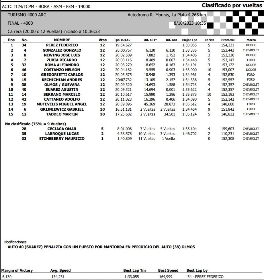 En el final, Pérez logró mantener su ritmo para llevarse la tercera victoria en su primera temporada por delante de González y Newing, mientras que recibieron su trofeo de reconocimiento Ricardo Zubía, en una fecha estratégica en función del campeonato, Alejandro Roma y Nelson Costanzo.