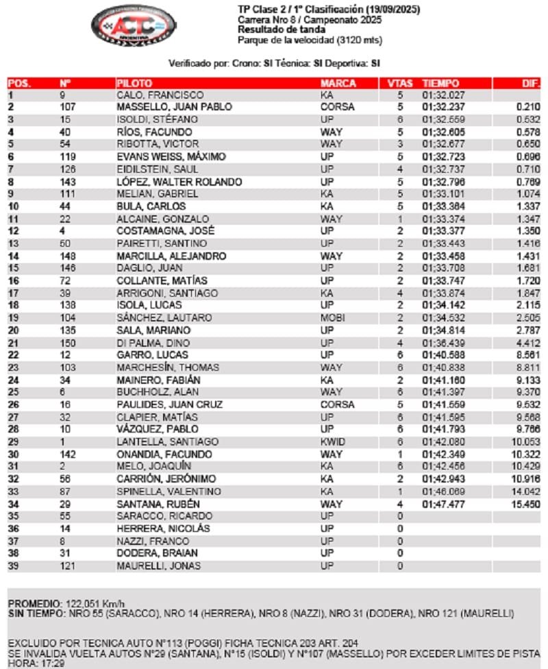 Completaron las cinco primeras colocaciones Stéfano Isoldi (VW Up), a más de medio segundo; Facundo Ríos (Fiat Uno Way), a 578; y Víctor Ribotta (Way), a 650.