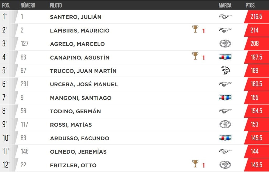 Lambiris, ganador en Termas de Río Hondo, no contó con un Mustang con buen ritmo, en un par de ocasiones bajó a la banquina, pero se las ingenió para llegar entre los 15 mejores y quedó a solo dos puntos y medio de Santero.